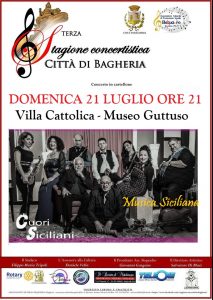 Cuori Siciliani @ Bagheria (PA) Un nuovo concerto, questa volta dedicato alla musica siciliana, già in cartellone nell’ambito della “Terza stagione concertistica Città di Bagheria”, si terrà domenica 21 luglio, alle ore 21,00, a villa Cattolica. La stagione concertistica gode del patrocinio del comune di Bagheria ed è organizzata dall’associazione Bequadro. Ad esibirsi sarà l’ensamble musicale “Cuori siciliani”. Il gruppo è composto da 8 musicisti, maestri e professionisti tra i più rappresentativi del nostro territorio e un narratore poeta, che ha…