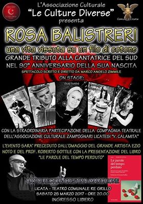 Rosa Balistreri – una vita vissuta su un filo di cotone @ Licata (AG) L’Associazione ” Le Culture Diverse “ PRESENTA : “Rosa Balistreri – una vita vissuta su un filo di cotone”, grande tributo all’artista licatese nel 90° della sua nascita. Spettacolo scritto e diretto da Marco Angelo Zimmile Con la straordinaria partecipazione della compagnia teatrale dell’Associazione Zampognari licatesi “Vincenzo Calamita” diretta da Ivan Frisicaro L’evento sarà preceduto dall’omaggio del grande artista Ezio Noto e del Prof. Roberto Sottile…