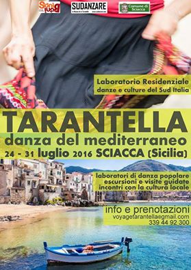 Un’anticipazione della nostra proposta per l’estate : SICILIA – La meravigliosa città portuale di Sciacca, sul mar Mediterraneo : Tarantella, Danza del Mediterraneo 24 – 31 luglio 2016 laboratori di danze popolari stage di danza tradizionale siciliana con il bastone escursioni e visite guidate… Info e iscrizioni : voyagetarantella@gmail.com www.sudanzareitalia.wordpress.com