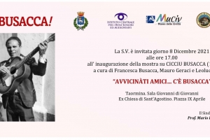 Avvicinàti amici…c’è Busacca @ Taormina (ME) mercoledì 8 dicembre, alle ore 17, nella sala Giovanni di Giovanni della Biblioteca comunale di Taormina viene inaugurata l’esposizione ” Avvicinàti amici…c’è Busacca”, che resterà aperta al pubblico fino all’8 marzo 2022. Allestita per la prima volta nel 2019 presso il Museo delle Civiltà – Museo delle Arti e Tradizioni Popolari di Roma per i trent’anni dalla scomparsa, la mostra ricostruisce l’iter poetico e artistico del grande cantastorie siciliano Cicciu Busacca (1925-1989). La mostra è stata progettata e…