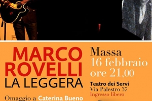 Marco Rovelli: omaggio a Caterina Bueno @ Massa (MS) Ricercatore di storie, scrittore e musicista, autore di narrazioni sociali su migrazioni e morti sul lavoro e romanzi, già componente de Les anarchistes, Marco Rovelli il 16 febbraio, alle ore 21, sarà al Teatro dei Servi di Massa, sua città natale, con La leggera, uno spettacolo di teatro-canzone che fa rivivere appieno il fascino e la bellezza di una singolare vicenda umana ed artistica qual è quella di Caterina Bueno, autentica…