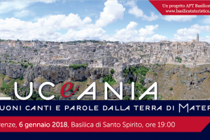LUCeANIA. Voci e suoni dal segreto della terra di Matera @ Firenze Il 6 gennaio, alle ore 19.00 nella Basilica di Santo Spirito a Firenze, si terrà lo spettacolo “LUCeANIA. Voci e suoni dal segreto della terra di Matera”. Lo spettacolo, si articola come alternanza di musica popolare eseguita da Ambrogio Sparagna, accompagnato da alcuni musicisti della sua Orchestra di musica popolare dell’Auditorium di Roma, e letture di brani a cura del poeta Davide Rondoni, direttore artistico e curatore…
