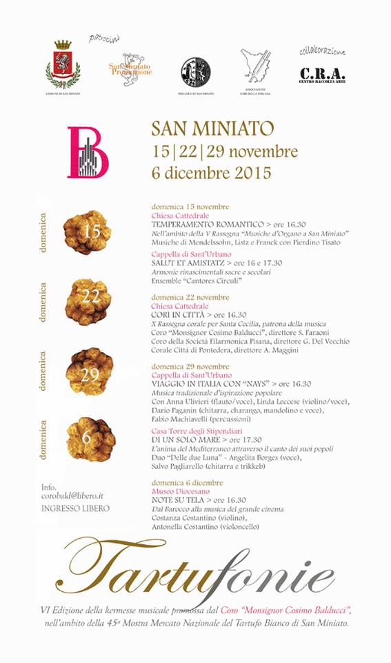 Riparte anche quest’anno Tartufonie, la kermesse musicale promossa e organizzata dal Coro “Monsignor Cosimo Balducci”, nell’ambito della 45ª Mostra Mercato Nazionale del Tartufo Bianco di San Miniato. La manifestazione è patrocinata dall’Amministrazione Comunale, dalla Fondazione San Miniato Promozione, dalla Pro Loco, dall’Associazione Cori della Toscana, ed è realizzata in collaborazione con il Centro Raccolta Arte.