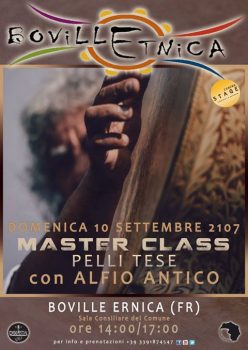 In collaborazione e in occasione del Festival Boville Etnica, Pelli Tese di Eduardo Vessella organizza , per la prima volta in Ciociaria, il MASTER CLASS di tamburi a cornice a cura di Alfio Antico.
